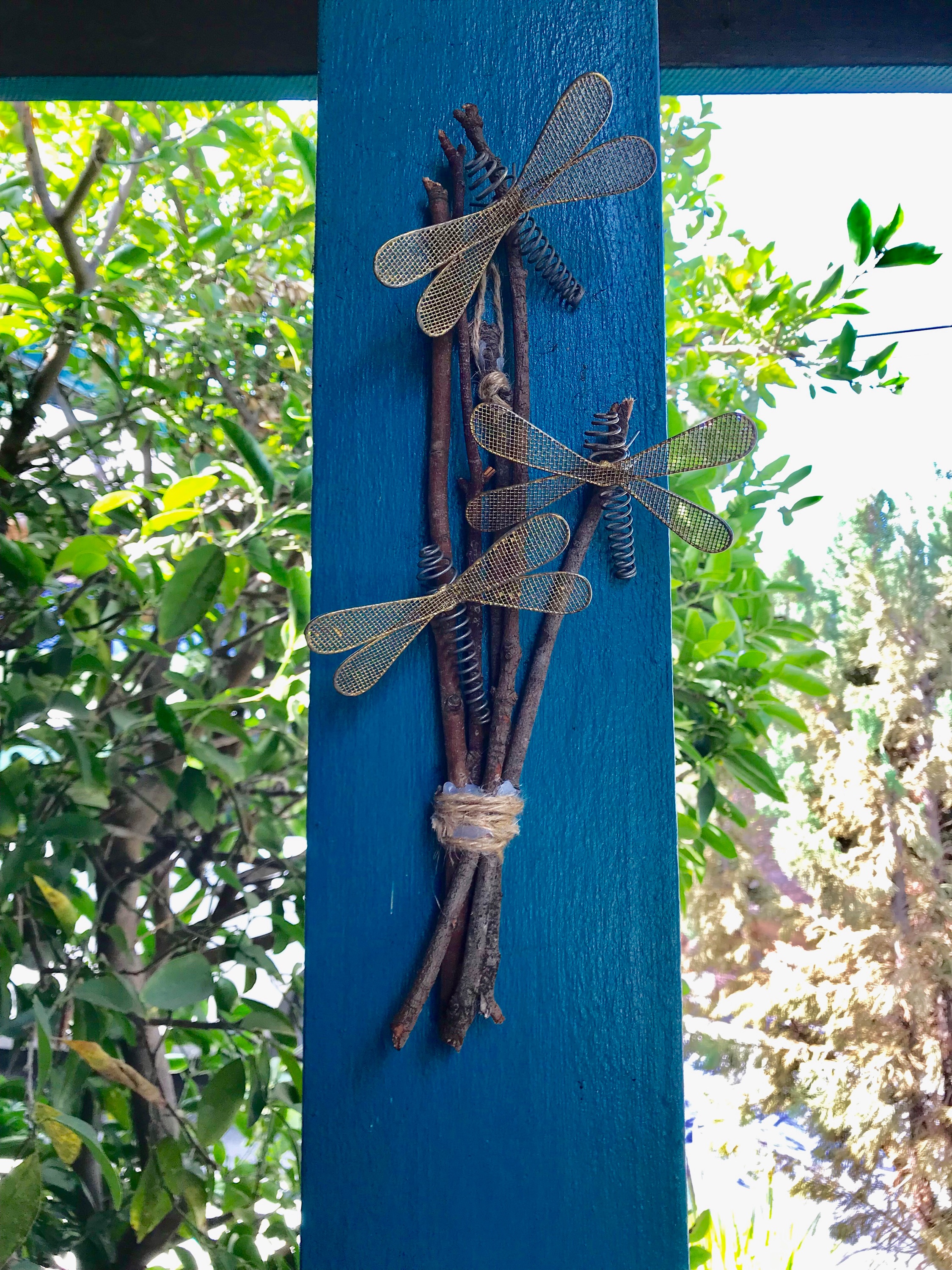 I absolutely love playing with sticks! I also have an affection for dragon flys. Here, I’ve combined the two to make a whimsical little decoration for my front porch.