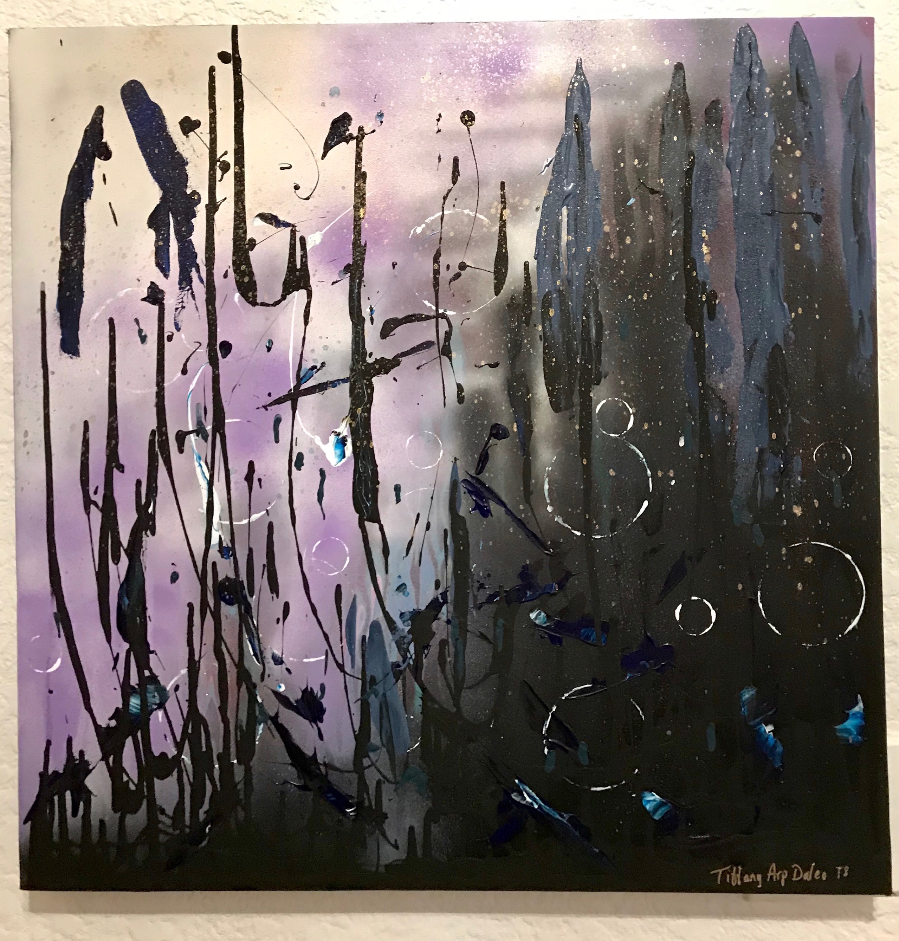 Painting on recycled canvas, 24″ x 24″ spray paint, acrylic paint, with knife and brush. September 2018.