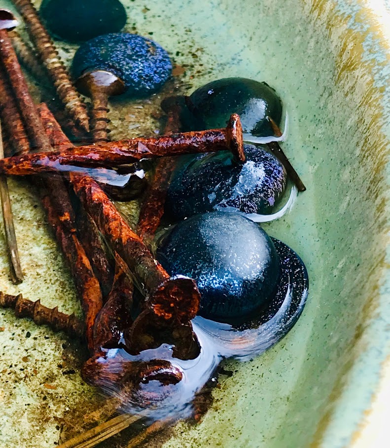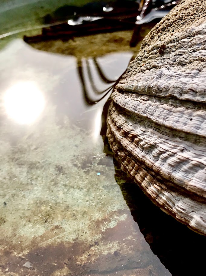 An old deteriorating abalone shell caught my eye, and became my muse for awhile, its bright iridescent colors still shine through after all these years. I also found some submerged rusty screws and forgotten rocks to entertain me. I thought the contrast was intriguing.