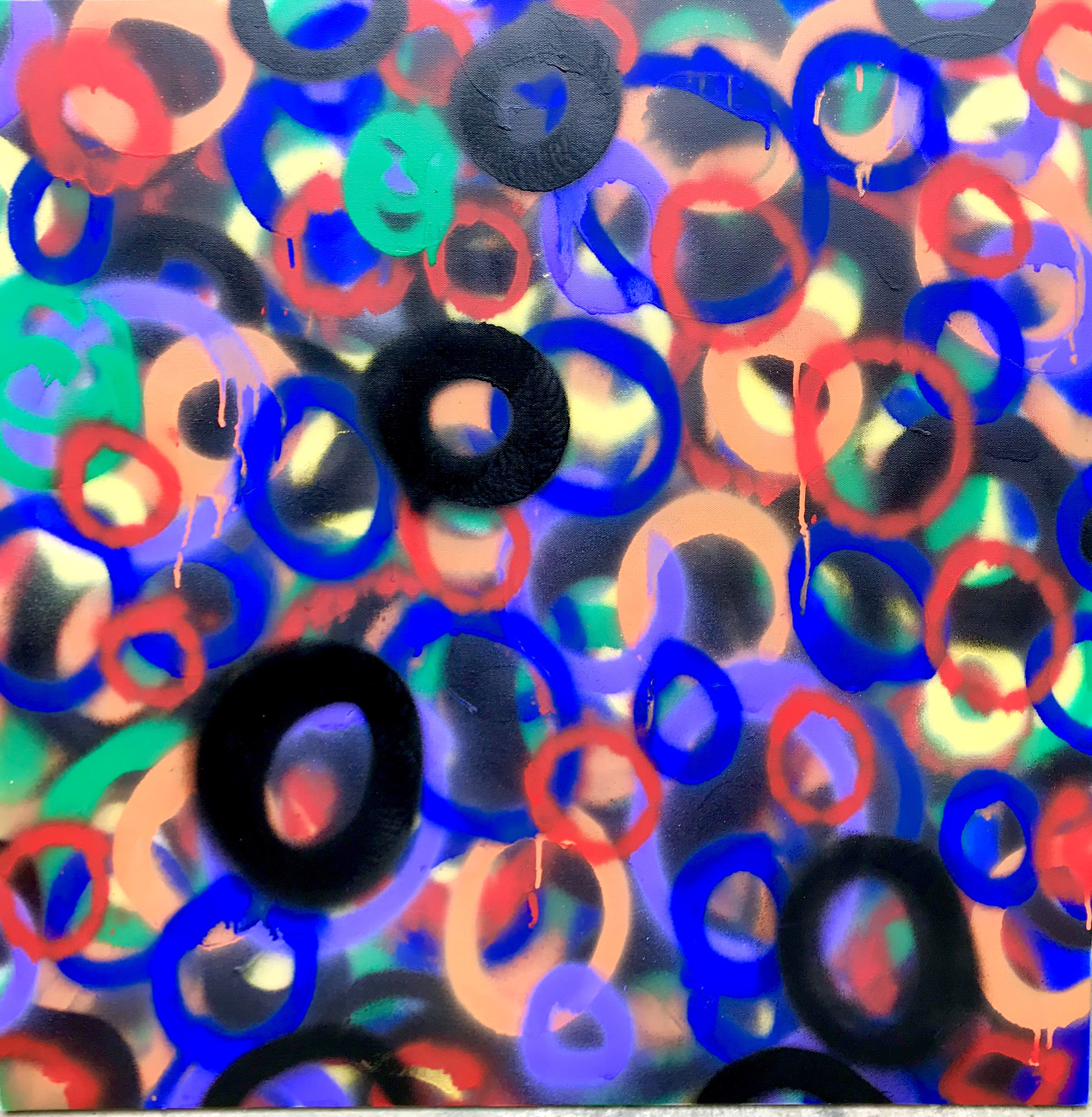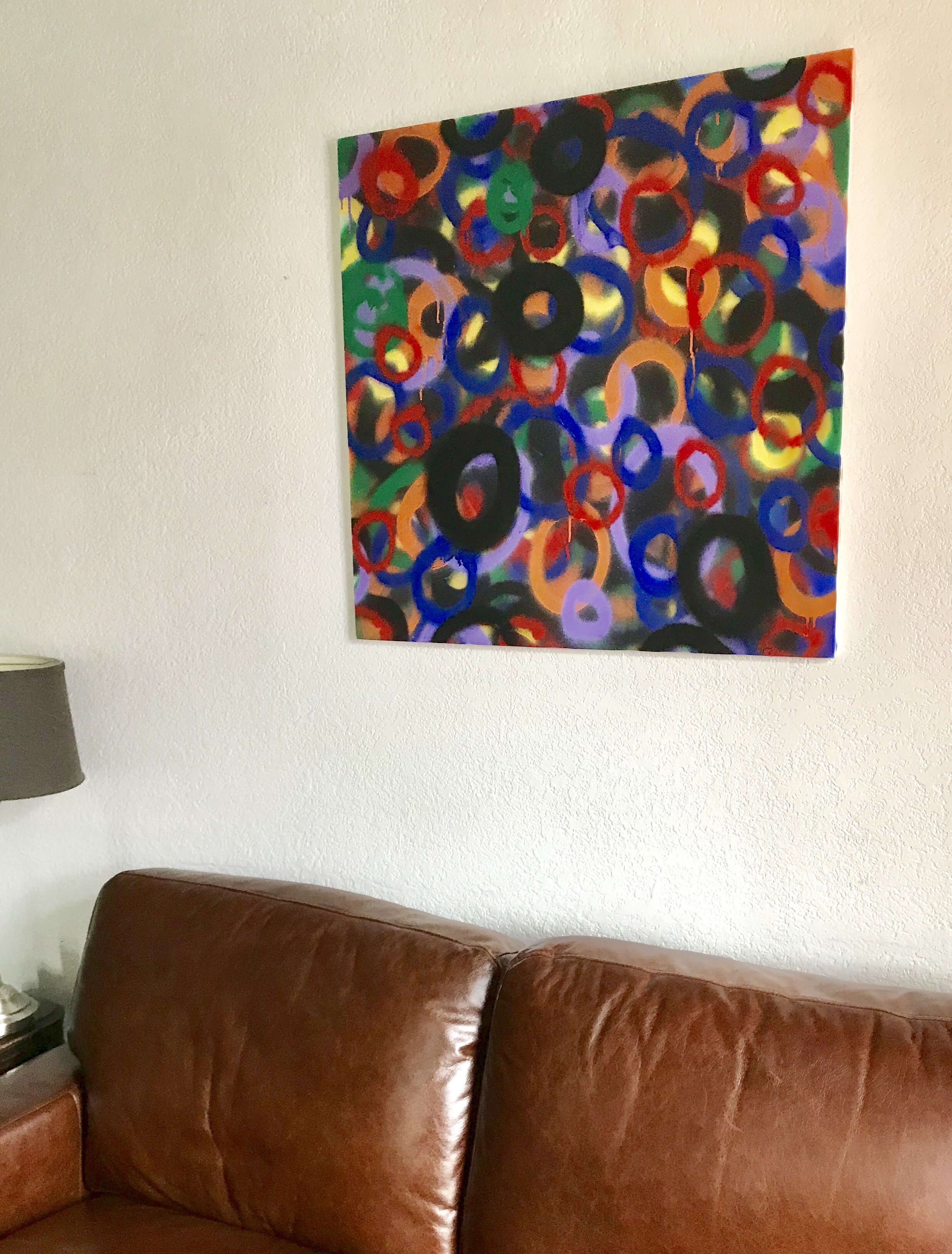 I had no idea that it would take me so long to complete, without stopping, it took well over two hours. There must be at least 100 layers of O’s! Working with spray paints requires constant shaking of the cans, and you have to spray at just the right angle, it was a very physical painting, my legs, back and index finger are all cursing me today!