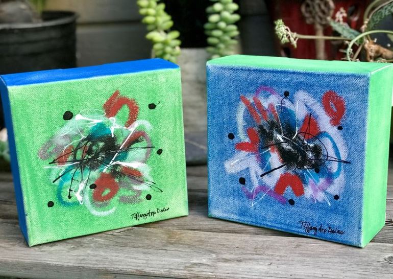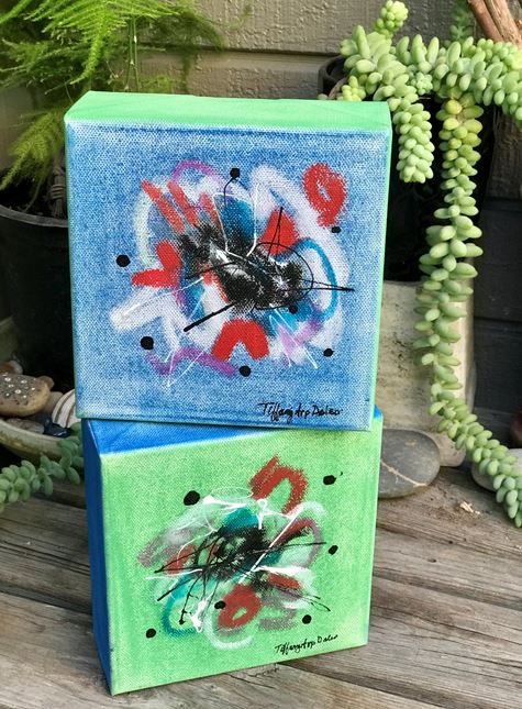 Just finished these cuties! Pastels and mixed media on 6” x 6” x 1 3/8” canvases. Aren’t they adorable?? 💚💙