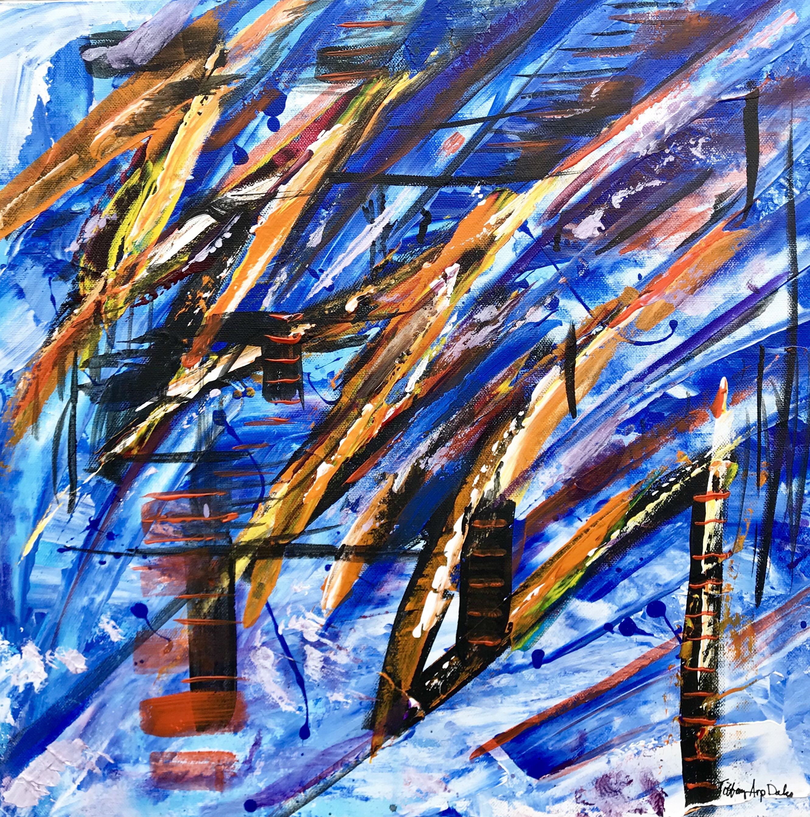 My first impression of this painting is a violent tsunami devouring a city. But I thought that is rather depressing, so I lightened it up a bit by naming it my favorite childhood game, “Chutes and Ladders”, but you can call it what you will!