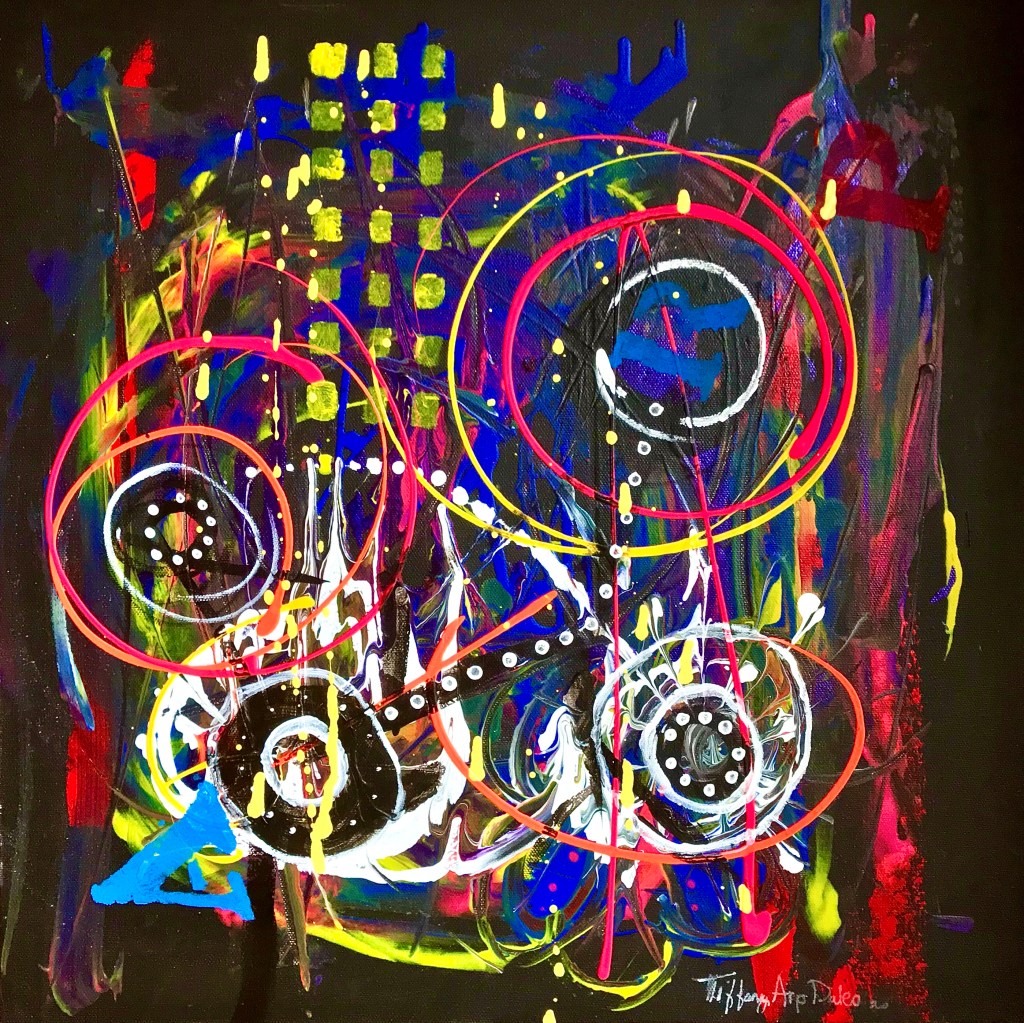 Acrylic abstract painting on gallery profile cotton canvas, 20" x 20" x 1.5". Wired for hanging. Price includes shipping within the US!