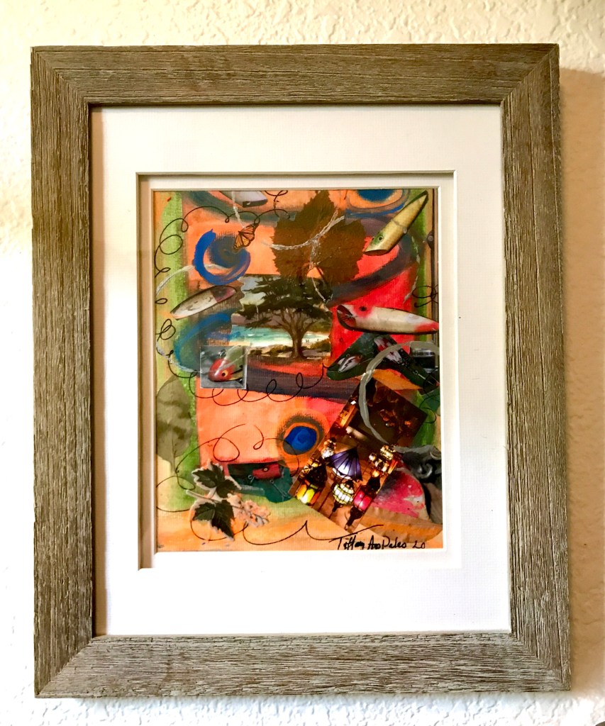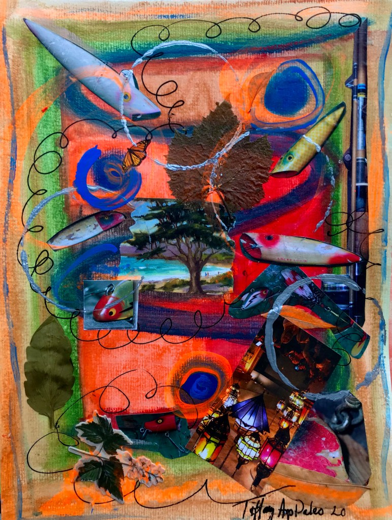 I love how this collage “Lured by the Light” turned out! I found the images of vintage fishing lures in a magazine some time ago and stashed them away until I found a good way to use them. The piece also incorporates some pressed leaves, gel pens, ink, and acrylic paint, sealed with a light coating of Mod Podge to keep it all intact.