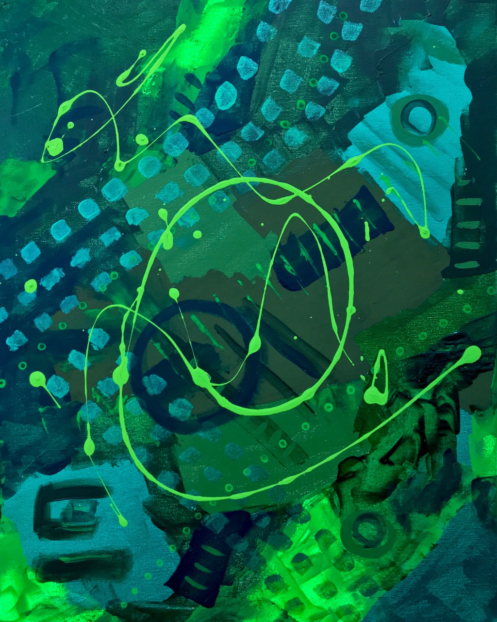 I’ve been working on a series lately, “Envy” is one of the pieces. Created with every shade of green acrylic paint in my arsenal, 11 shades to be exact, it’s layered randomly, applied and dispersed with knife, brush, and fingers.