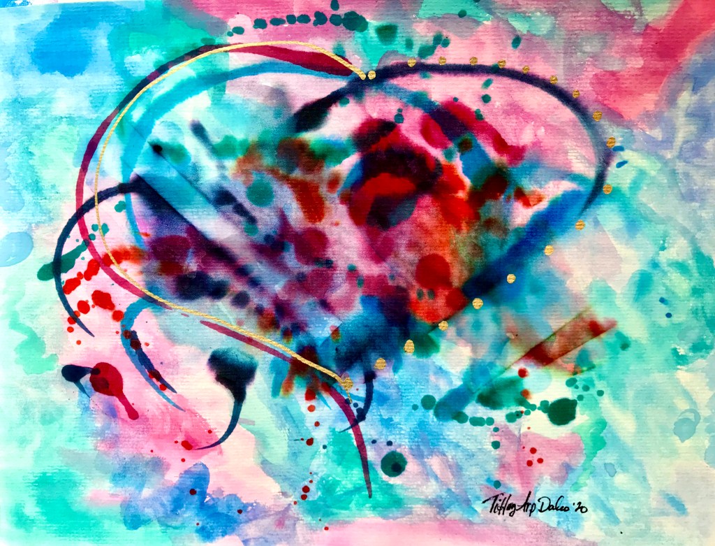 Created with watercolor, alcohol inks and acrylic paint, “Ghost Heart” appeared as half of a heart, then I dotted the other half with gold metallic dots to symbolize a separated love. Perhaps a love lost to the heavens, or just a temporary separation, we all know the pain and yearning of missing someone we love. I hope that this image brings comfort in knowing you are never alone as long as you hold their memory in your heart.