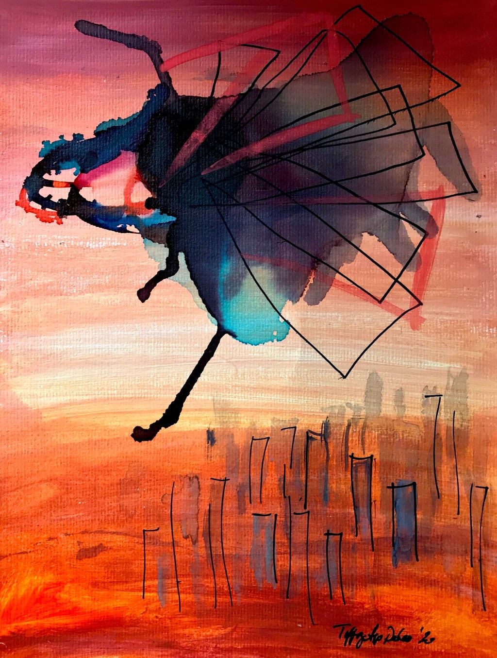 Created with an open mind, some acrylic paint, alcohol ink, and marker pens, “Traversing” is a little bit whimsical, a little ominous, and seriously 2020!