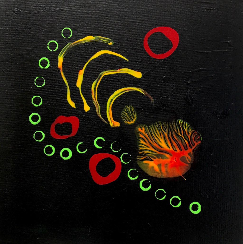 The 12″ x 12″ canvas was home to another painting that didn’t make the cut, so I spray painted over it with black, leaving some fun texture from the previous tenant! The rest of the painting was leftover watered down acrylic paint from a pour, the red and green circles are there, just because. 💚❤