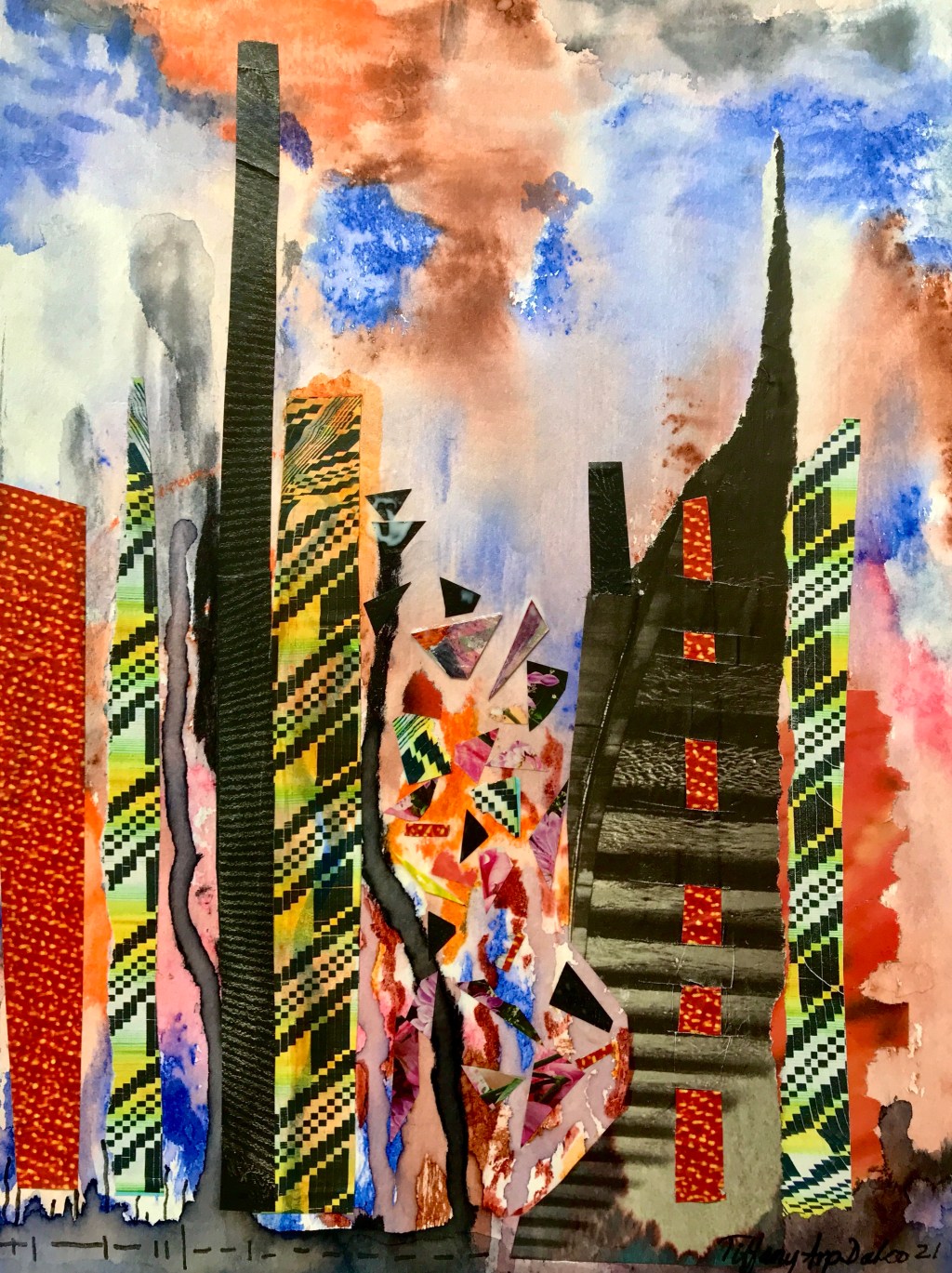 I’m terrified of structures. Buildings, bridges, the entire infrastructure. It can all collapse at any moment, the earth could open up and we could all get sucked into oblivion. True story. But, until then, here is an abstract mixed media collage full of life and happy colors!