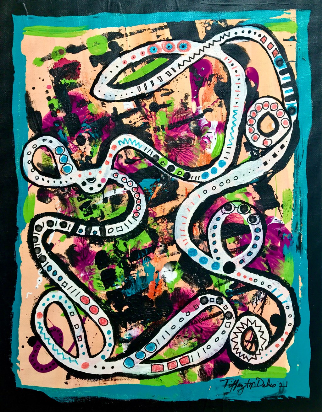 This began as a practice board, a canvas panel that I used to play with colors and brush techniques. I added the white pathway around the canvas, then it took on a new life. Keeping with the original color palette, I added detailed lines, marks, and dots. It could be a game board, or perhaps a treasure map or a maze, I simply like the colors all tangled up a messy knot! (kind of like my unruly hair!) πππ¨