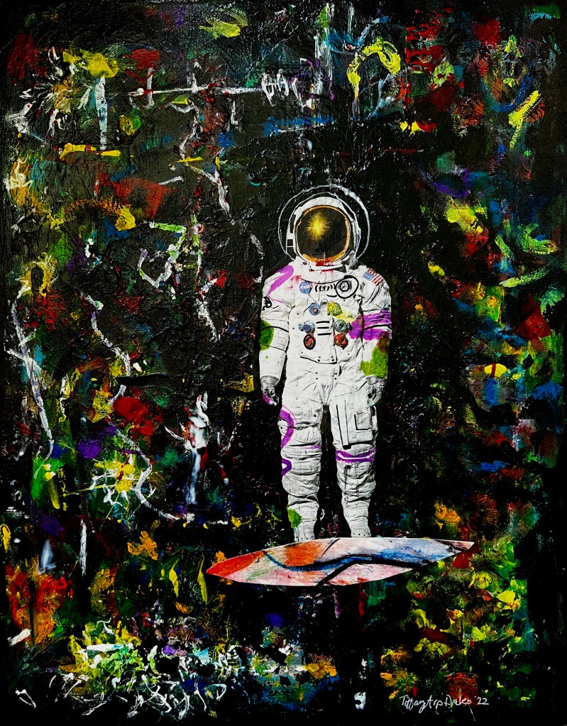Thanks, Judy! There are gobs of thick paint all over the canvas, the only parts that are collaged are the astronaut and the surfboard!