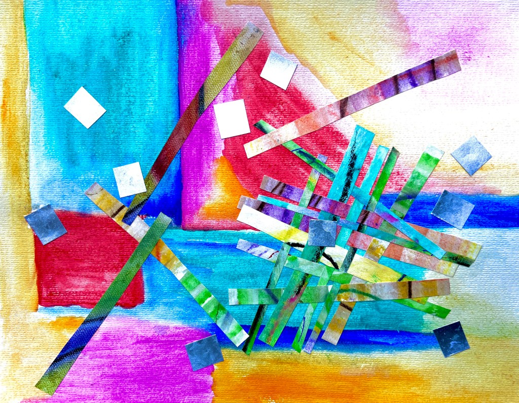 “Sound of Silver” is an 11″ x 14″ mixed media collage on paper. Watercolor, mixed media gel sticks, gouache, and cut-up pastel paintings, yep, that’s a real mix of media! Oh, and I used silver metallic spray paint (it’s hard to see their shininess in this photo) for the silver squares.