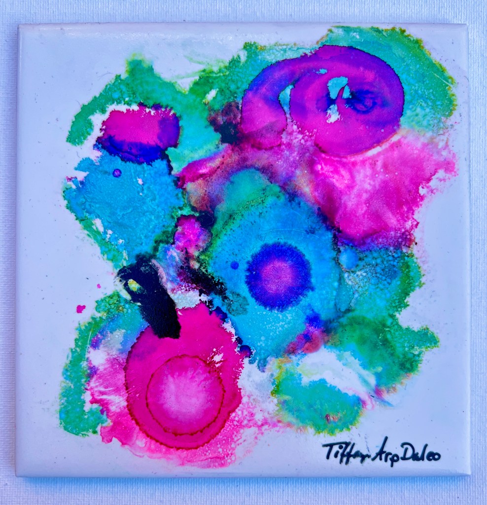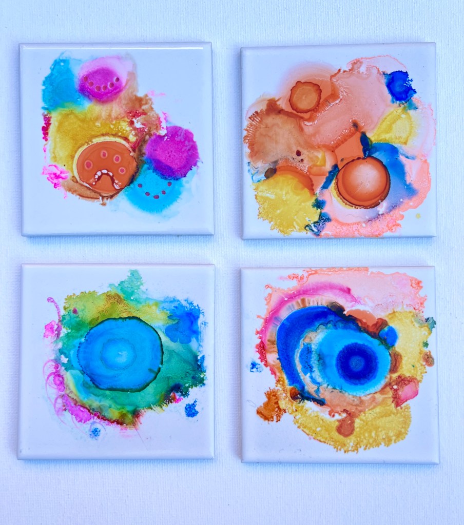 Ceramic is the perfect base for alcohol inks, and the white background really makes the colors pop! They sealed up nicely with a coat of spray varnish, and I think the small ones will make a cheerful set of coasters!