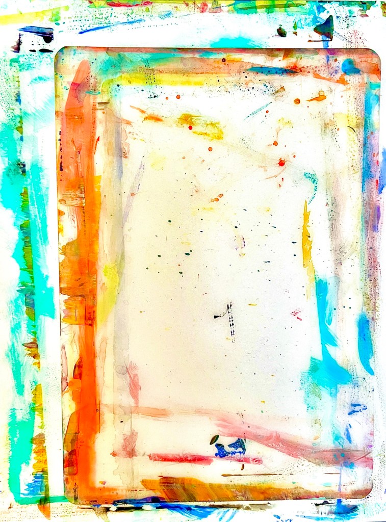 These three images are not actual paintings but photos of the plastic page shields that come with my sketchbooks. I like the random angles and mix of colors. Layered, they make their own story, like so many unassuming things in our daily lives!
