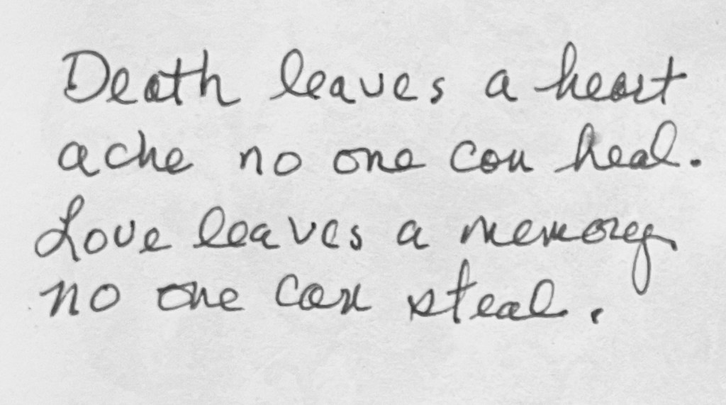 When she was first diagnosed with dementia, she went through her things and got rid of a lot. Besides being a great artist, she was also a writer and wrote poems and stories, but sadly, most of that she threw away. While I was going through her remaining belongings, I found this poem on a small piece of paper and decided to keep it. She probably wrote it after my dad passed away.