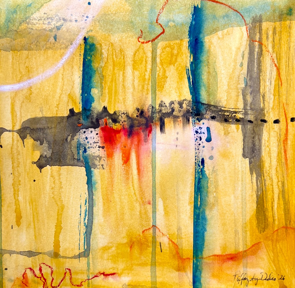 In this painting, I’ve layered acrylic, watercolor, gouache, and oil pastels. I think they all play nicely together!😊